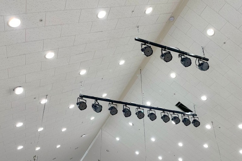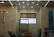 천정 형태가 박곡형태의 구조이기 때문에 강대상 조명은 앞쪽으로, 더 높이 설치가 되었습니다.