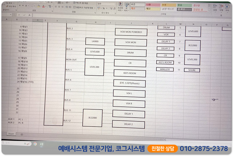 메인스피커 2회선, 보컬모니터 1회선, 드럼모니터 1회선, 방송실 모니터 1회선,