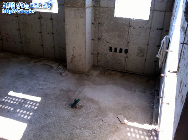 이제 콘크리트가 타설되어, 바닥 배관이 입구만 보이네요.