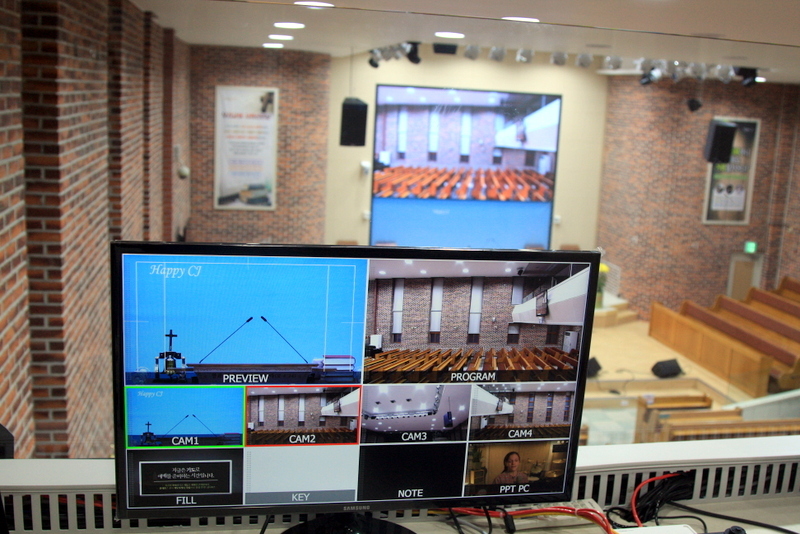 입력채널은 4개의 카메라와 방송실의 PPT PC, 자막기 PC, 그리고 강대상 노트북 입력 등으로 구성하였고요,