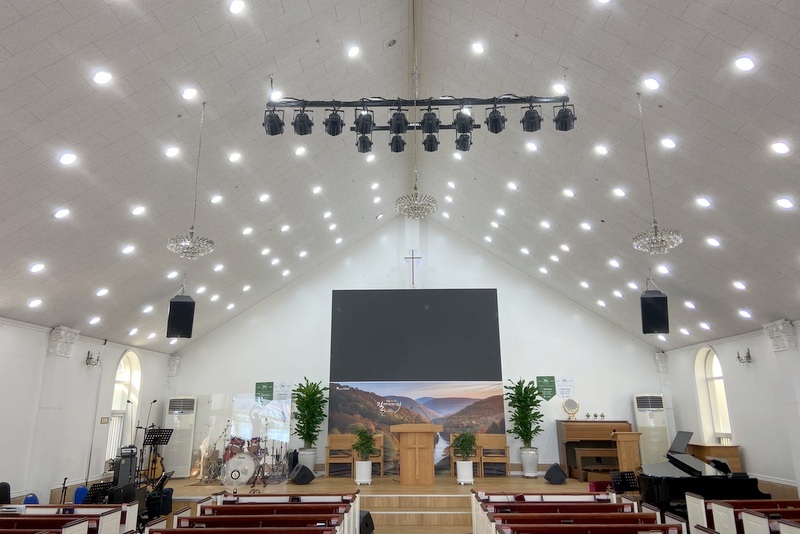 천정 형태가 박곡형태의 구조이기 때문에 강대상 조명은 앞쪽으로, 더 높이 설치가 되었습니다.